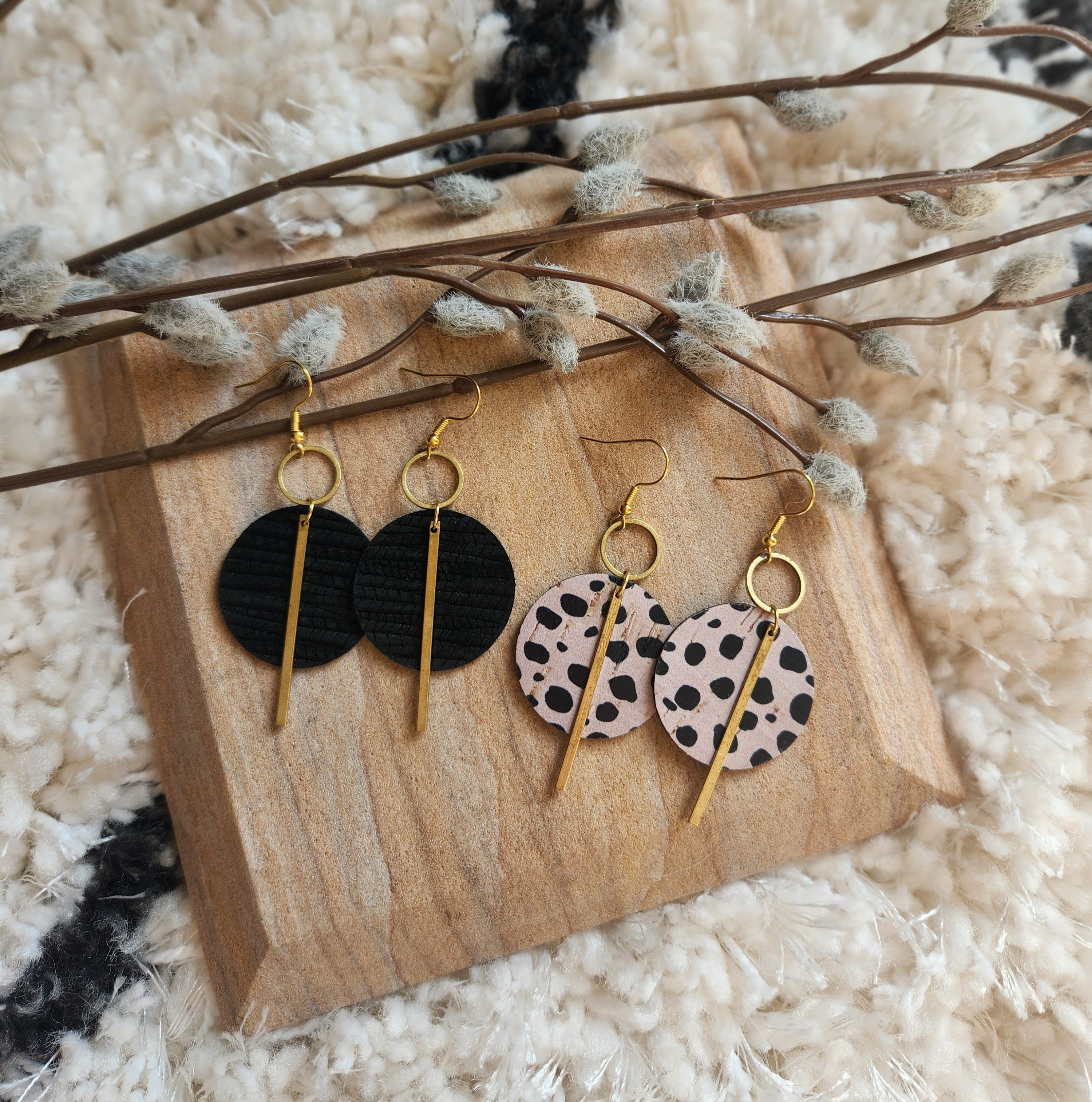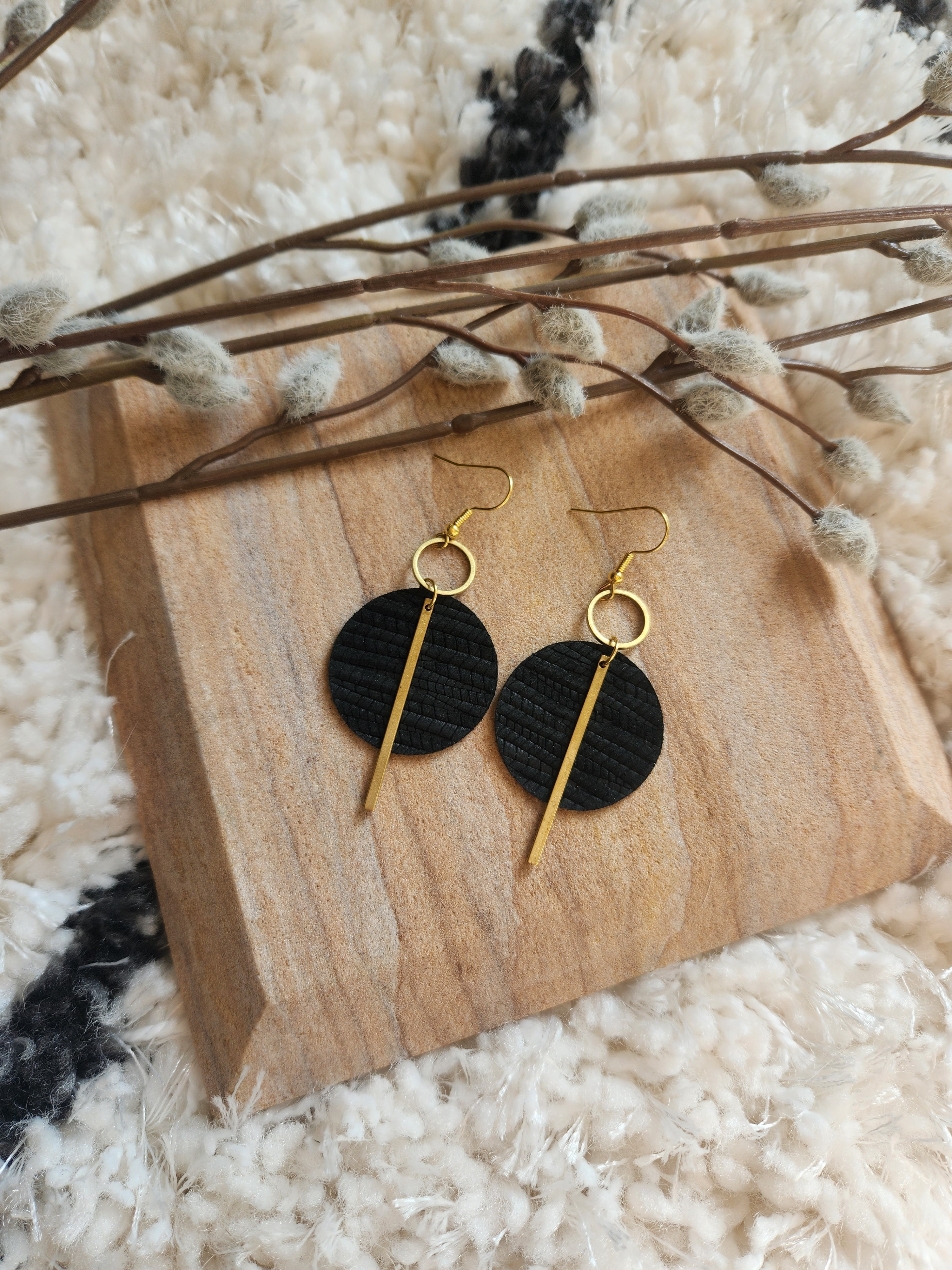 A gorgeous statement earring in genuine leather and brass finding accents.