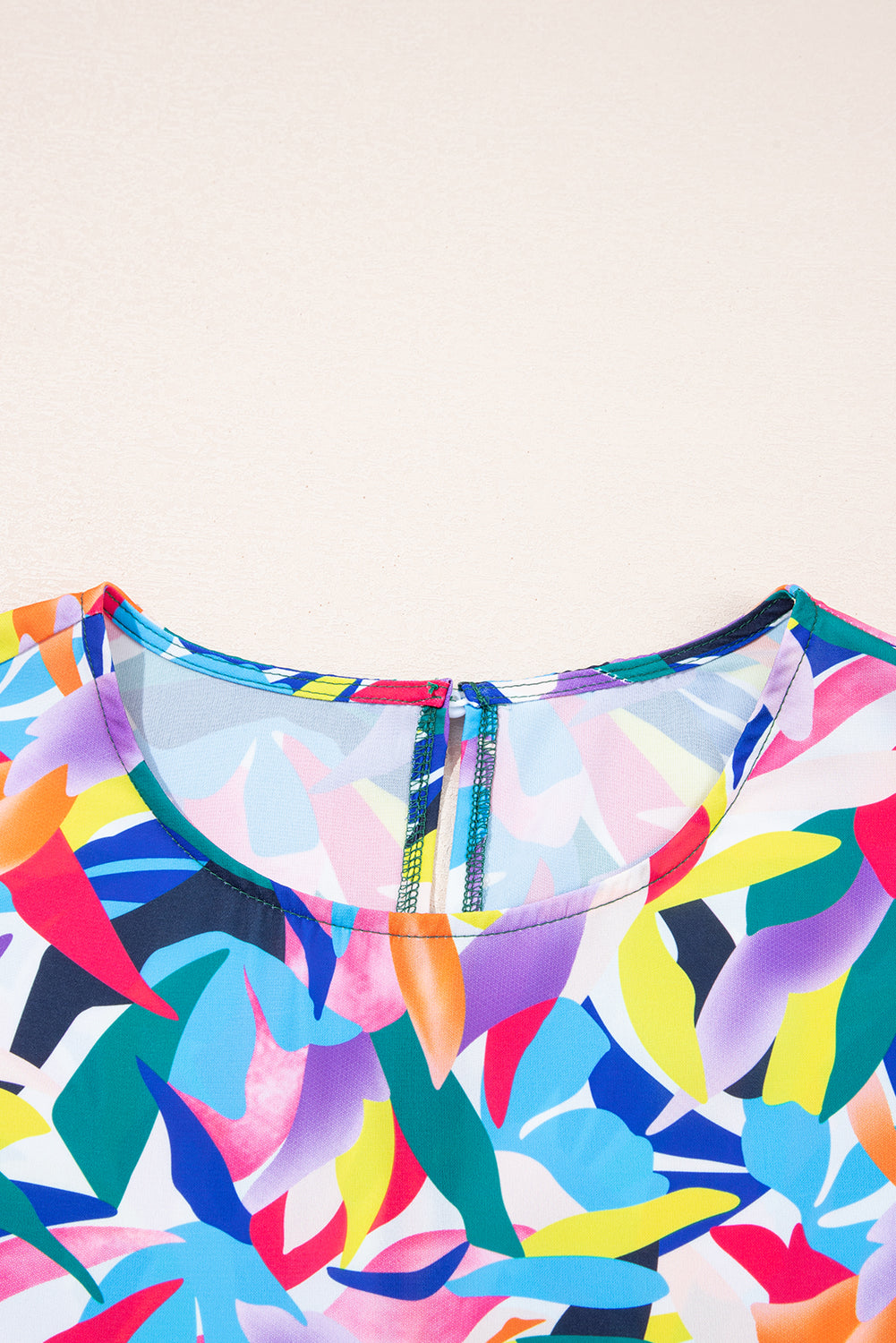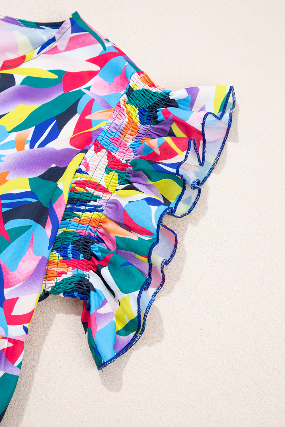 Blue Abstract Print Ruffle Sleeve Plus Size Tiered Maxi Dress